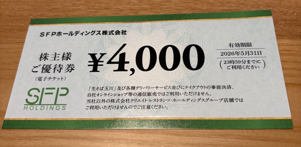 SFPホールディングス(3198)の株主優待が到着!磯丸水産や鳥良商店で使える食事券4,000円分【2026年5月まで】