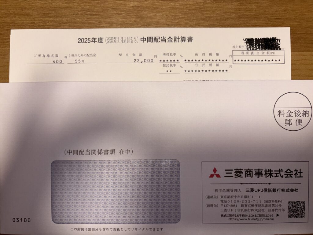本日、三菱商事から 2025年度の中間配当 が届きました。