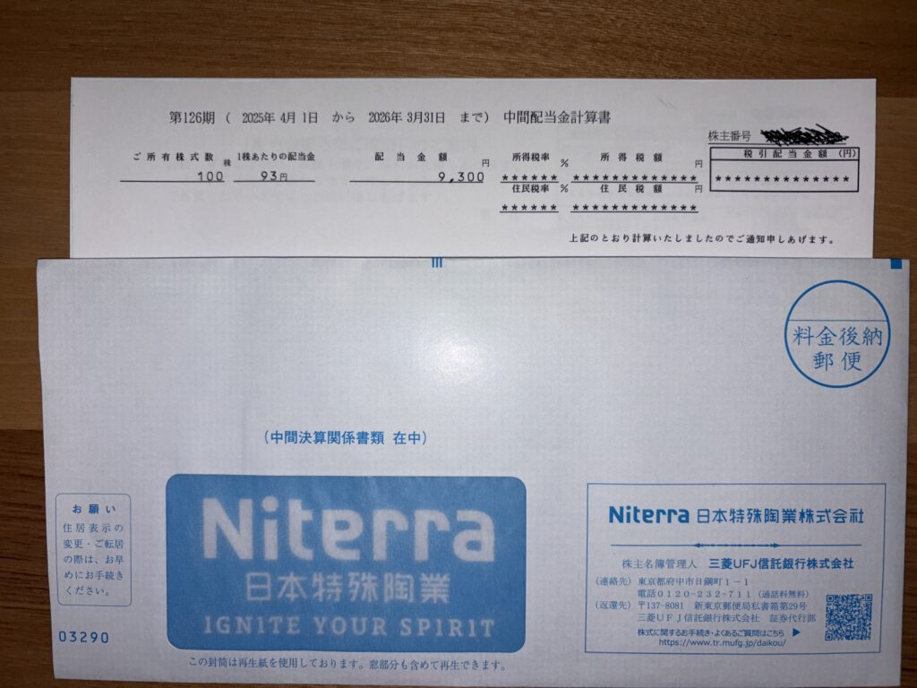 今年もついにNiterra(日本特殊陶業)から配当金の通知が届きました。