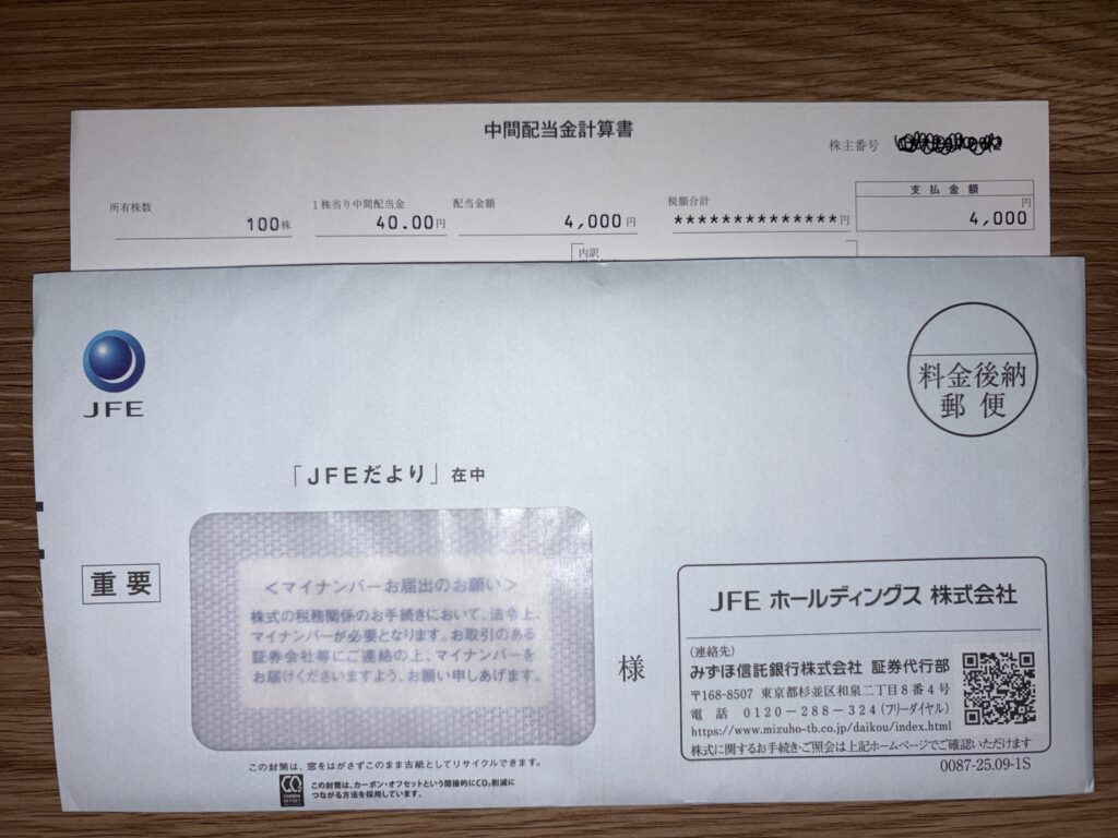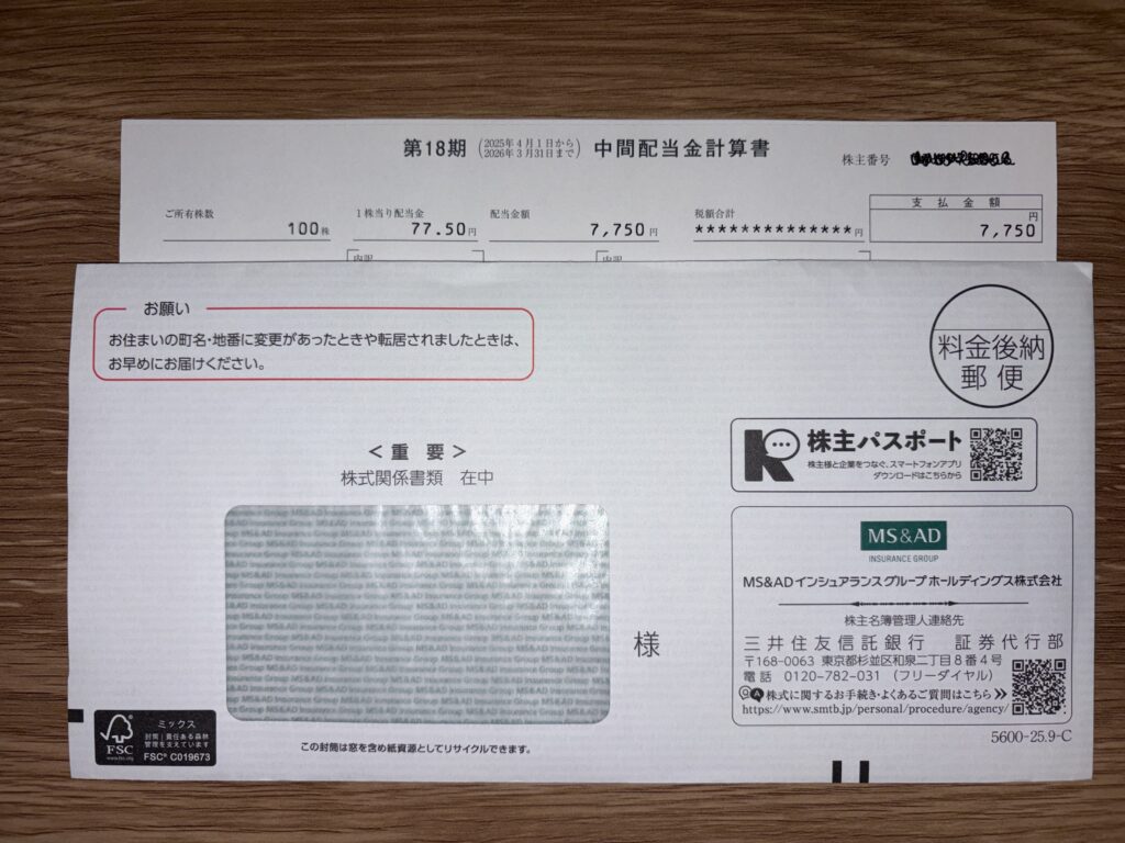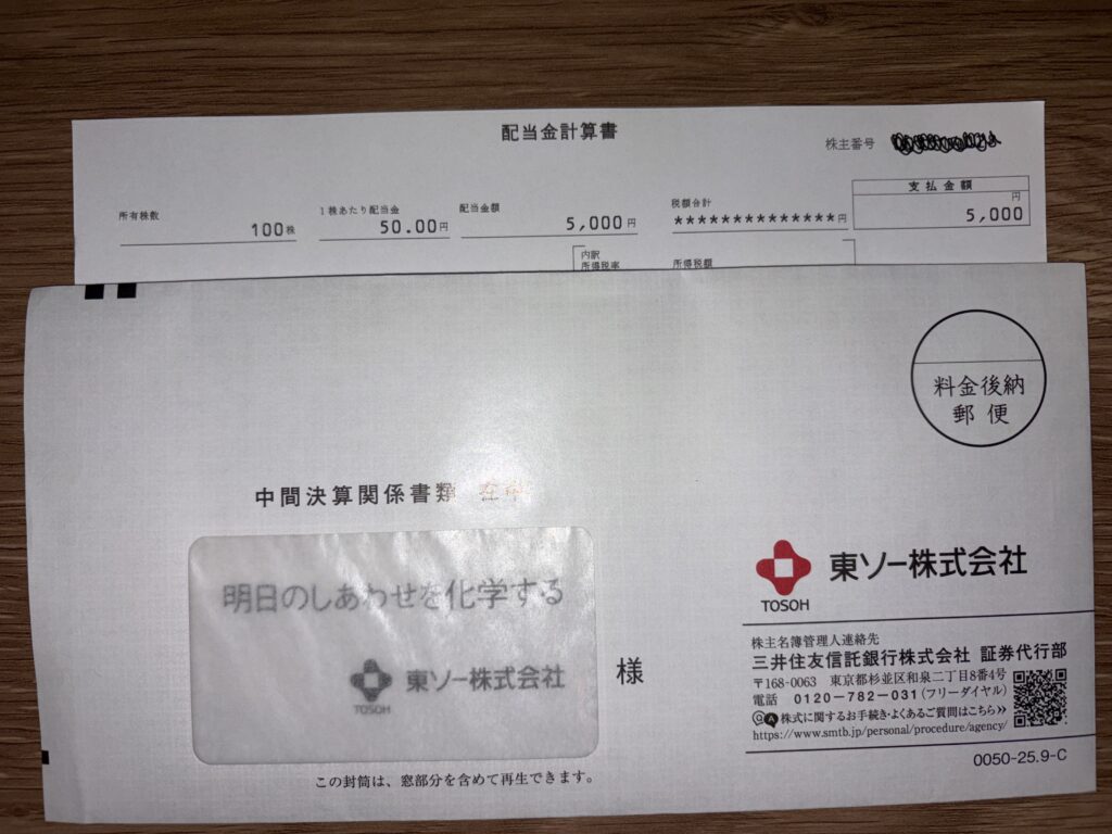2025年3月期の中間配当金計算書が3社から届きました。