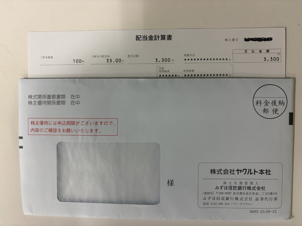 2025年4月1日〜2026年3月31日分として、株式会社ヤクルト本社から中間配当金が届きました。