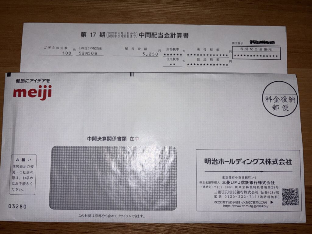 今回は、明治ホールディングス(2269)の2025年4月1日〜2026年3月31日 中間配当金が入金されたので、株主目線でわかりやすくまとめます。