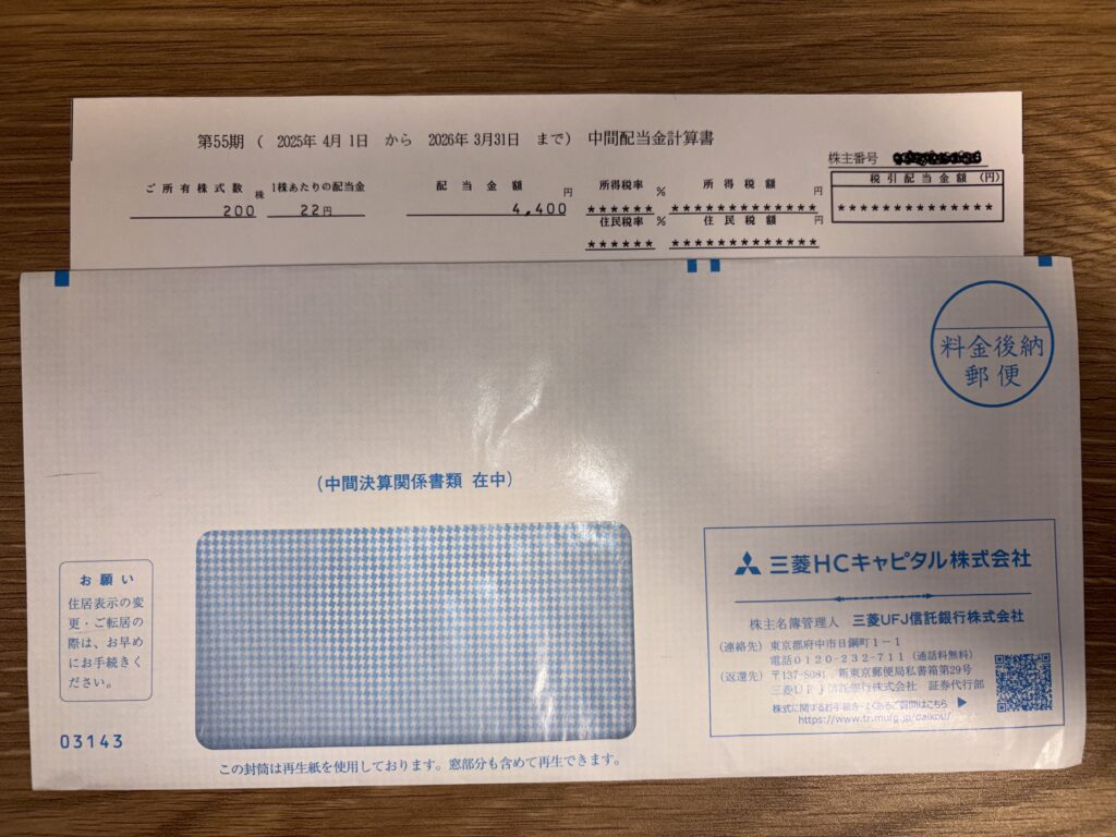 2025年4月1日〜2026年3月31日分の三菱HCキャピタル(8593)普通株式の中間配当金が入金されました。