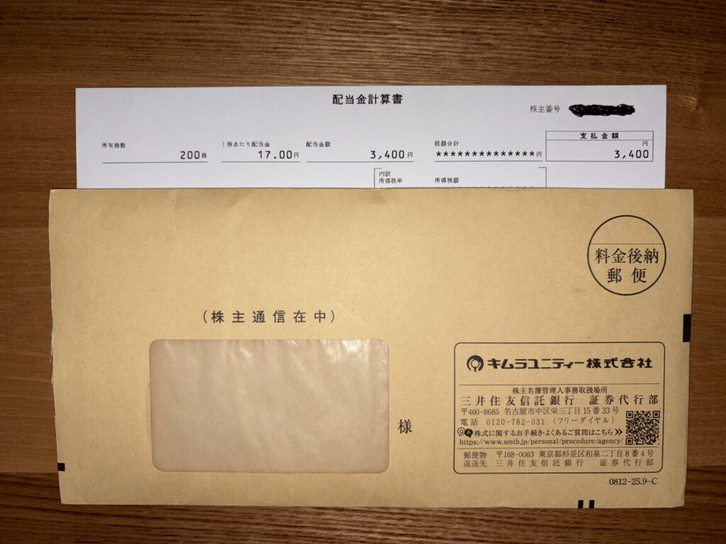 2025年4月1日〜2026年3月31年分のキムラユニティー(9368)の普通株式・中間配当金と株主優待が届きました。