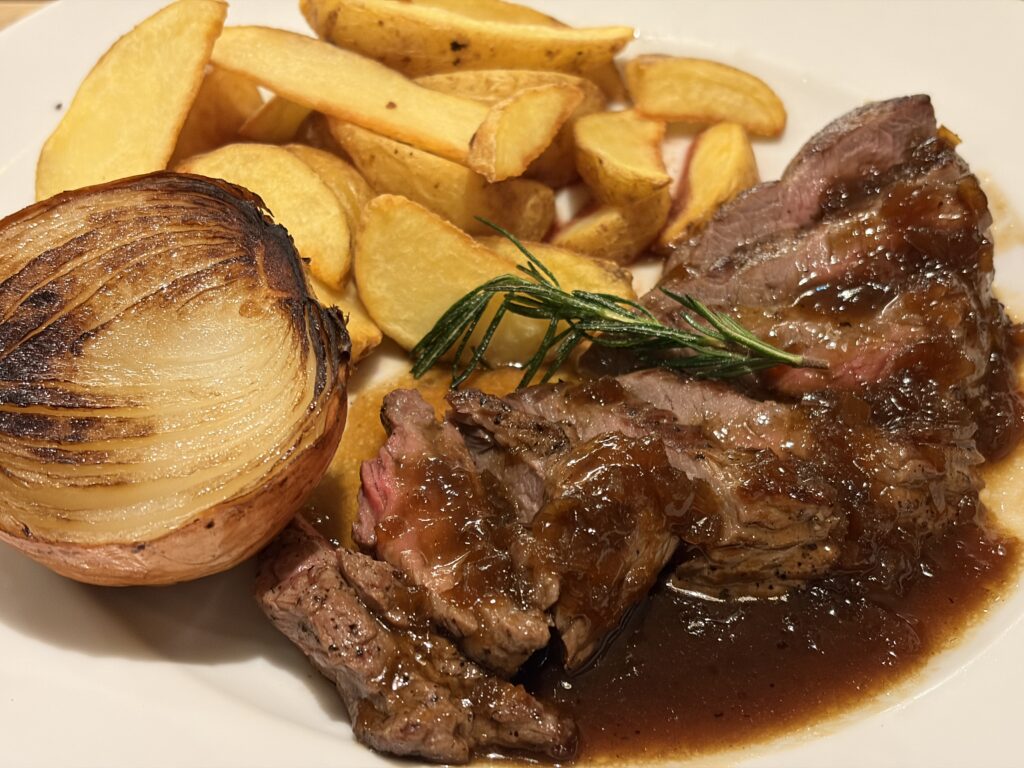 焼き目のついた玉ねぎが丸ごと添えられていて、見た目のインパクトもあります。