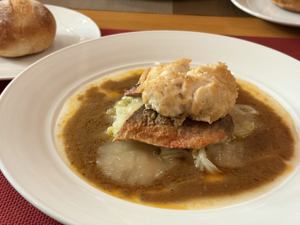 皮目は香ばしく、中はふっくらとした赤サバに、クリーミーで濃厚な白子の天ぷらが寄り添います。和の要素も感じられる一皿で、コースの中でも印象的なアクセントになっていました。