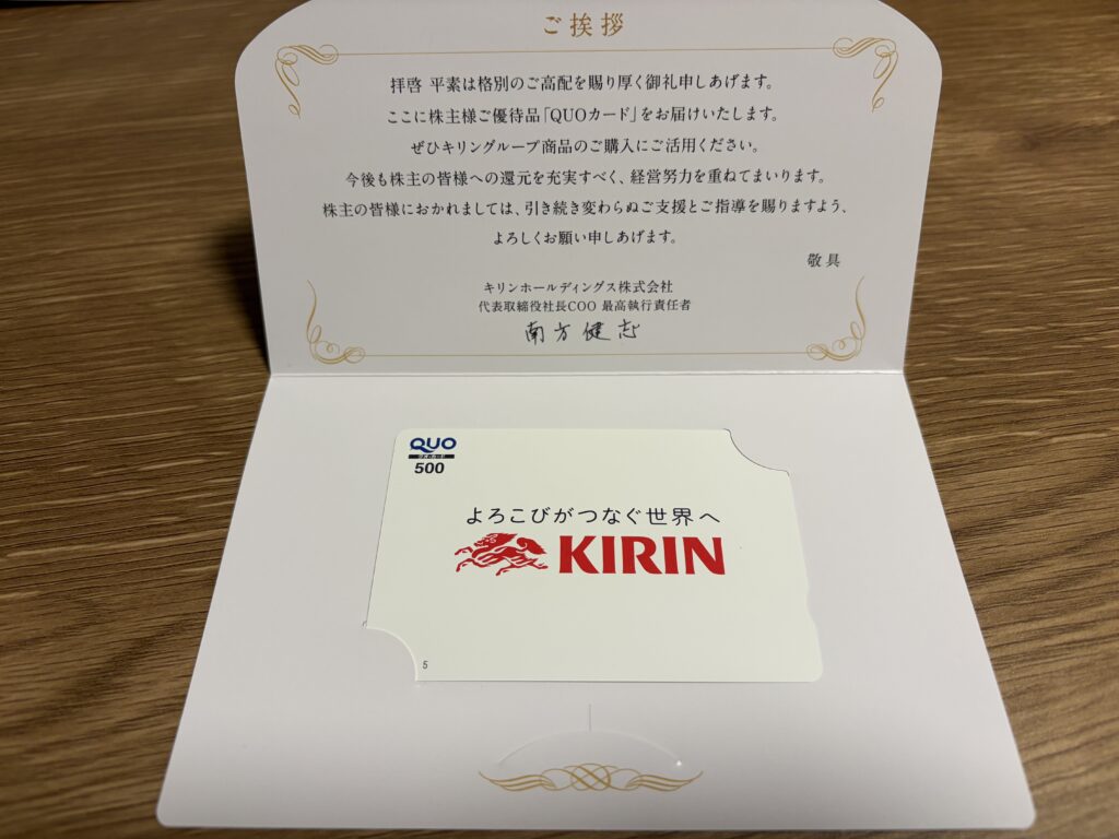 今回、私は 100株保有で保有期間が1年以上3年未満 のため、株主優待として 500円分のQUOカード をいただきました。