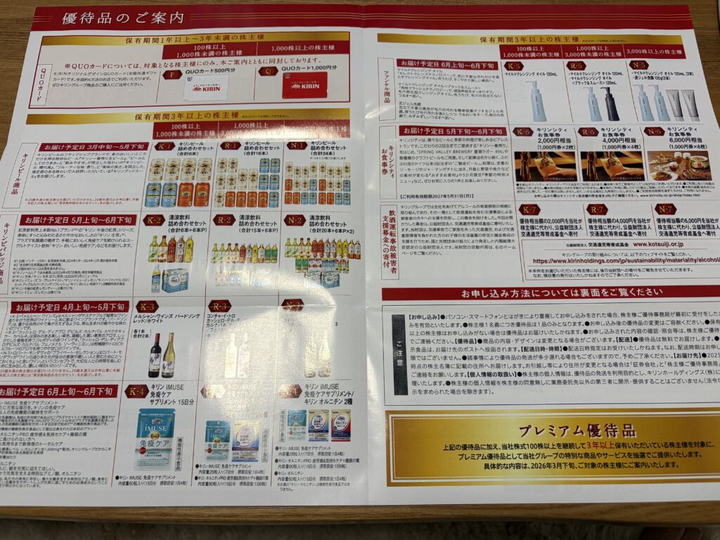 先日、キリンホールディングスから株主総会の案内と一緒に株主優待の案内が届きました。